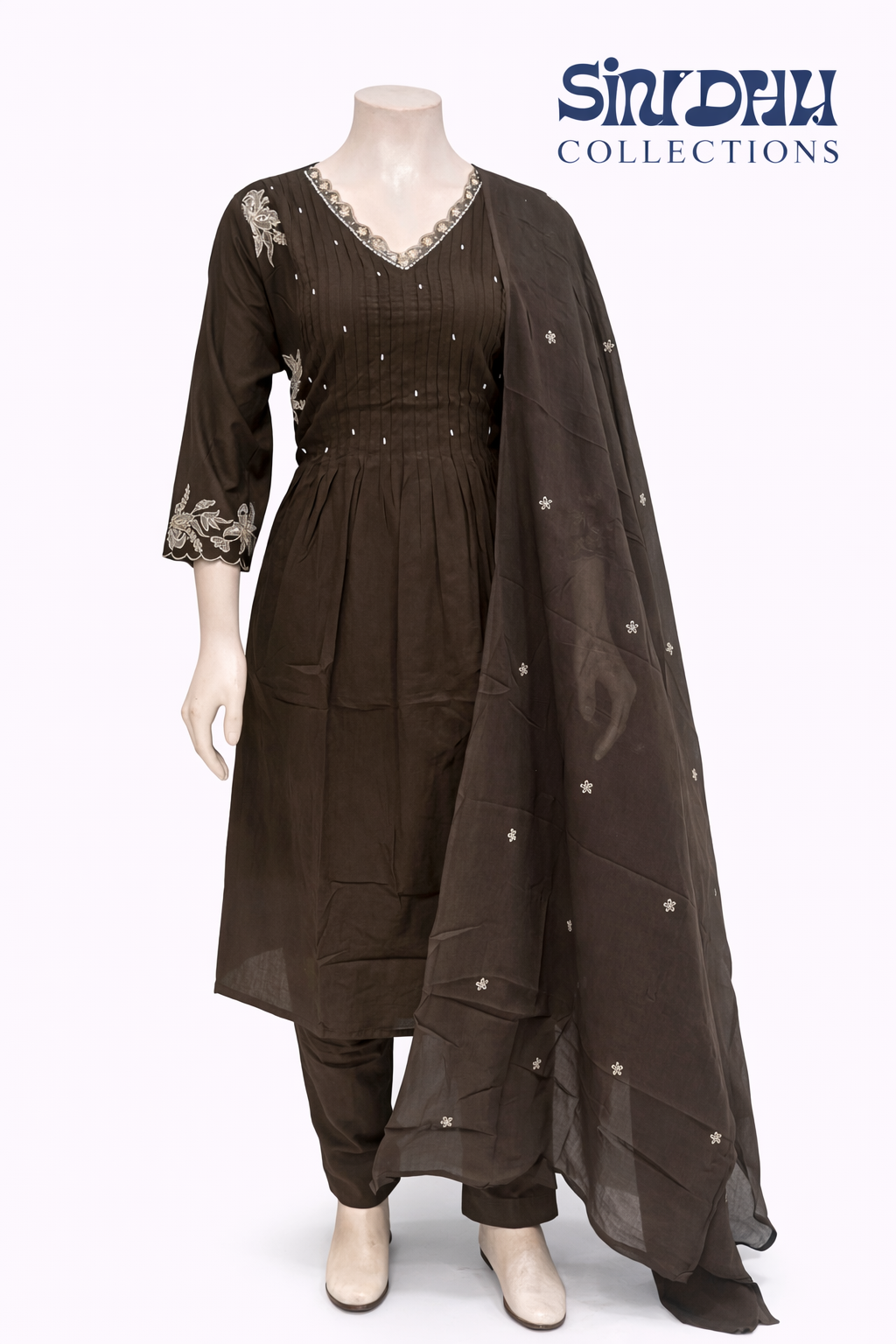 Mul cotton v neck pattern a line 3 piece kurti set with a neat thread work detailing