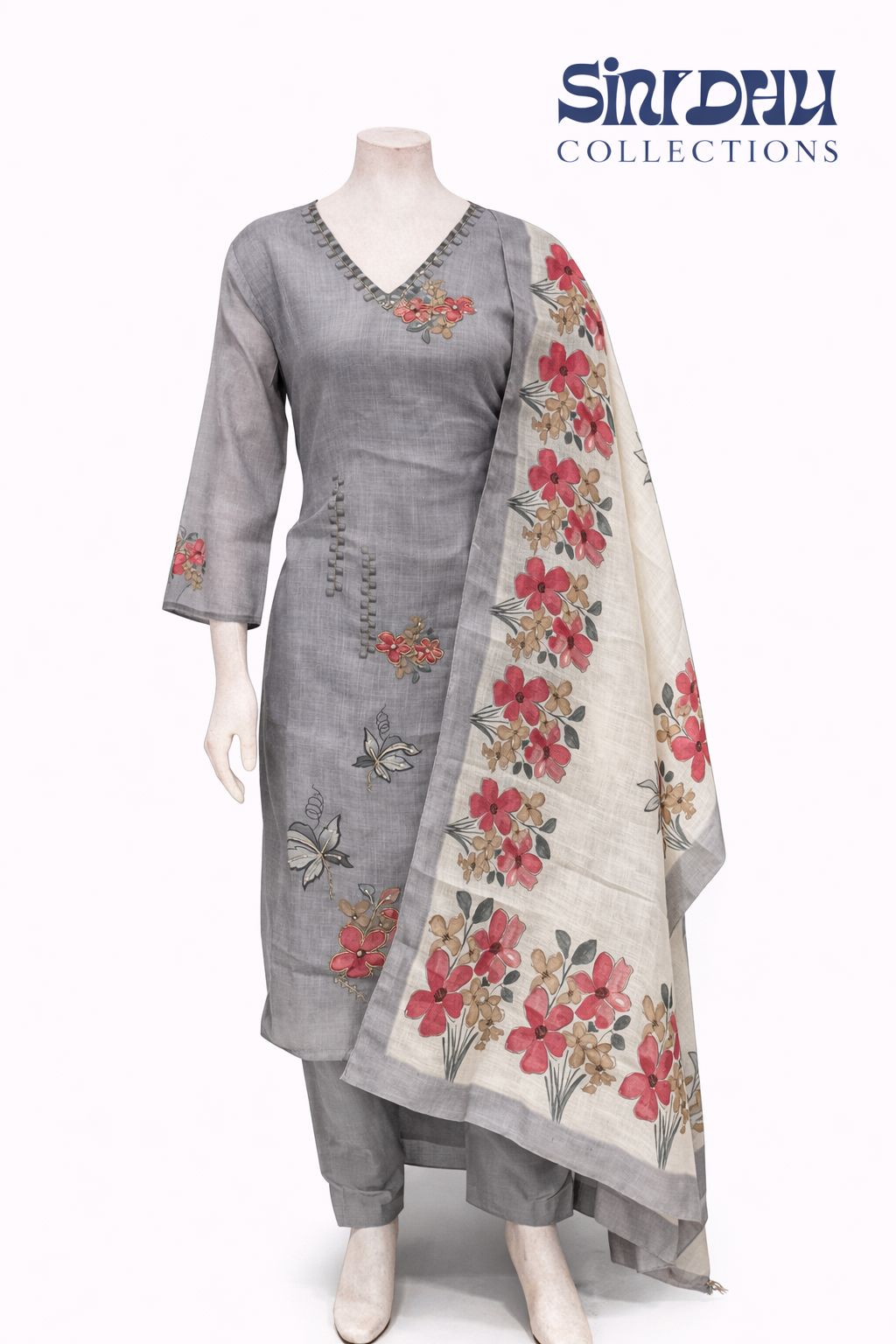 Pure cotton grey colour 3 piece kurta set contrast floral print dupatta